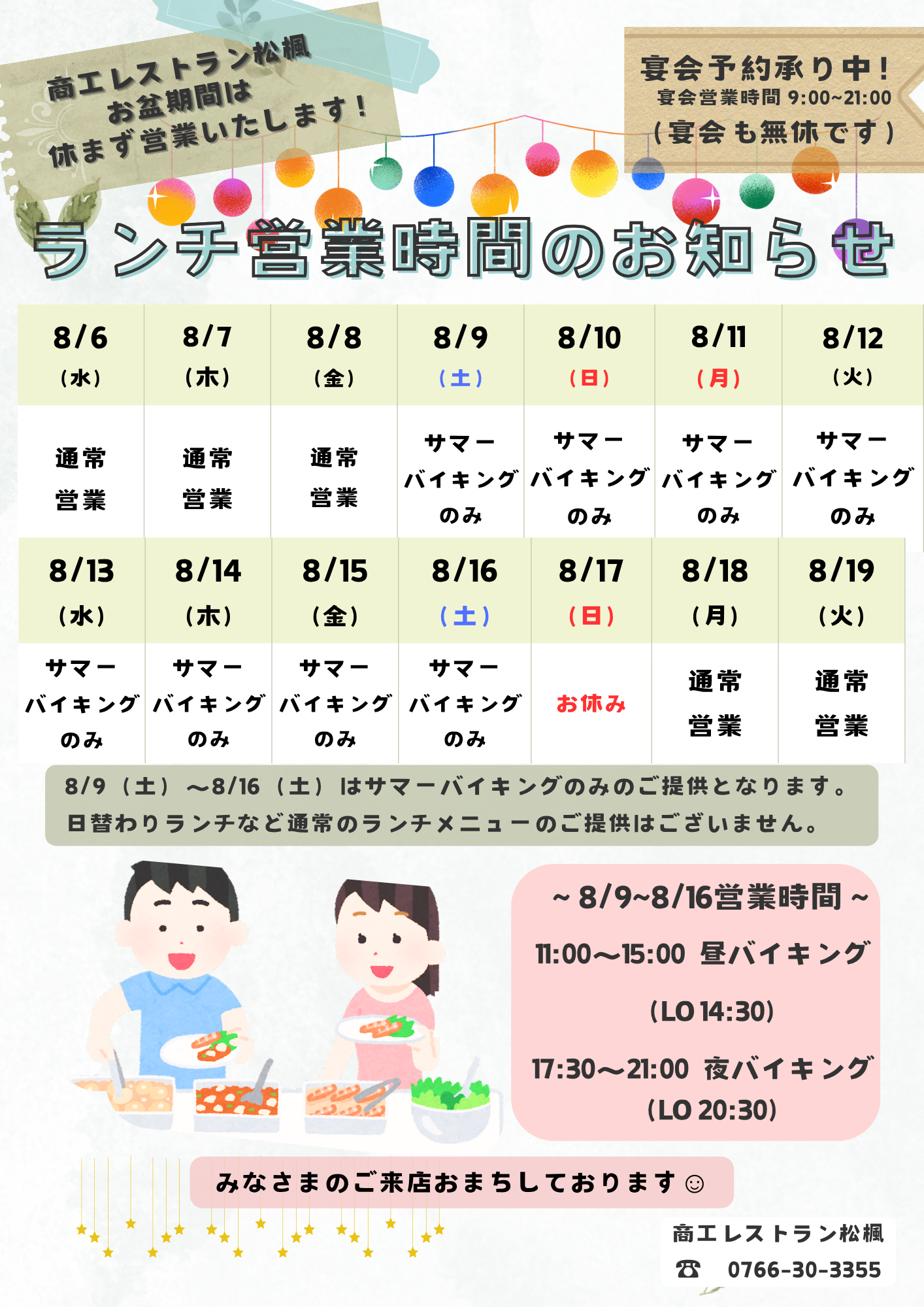 8/6(水)~8/19(火)までのランチタイムの営業時間のお知らせです。